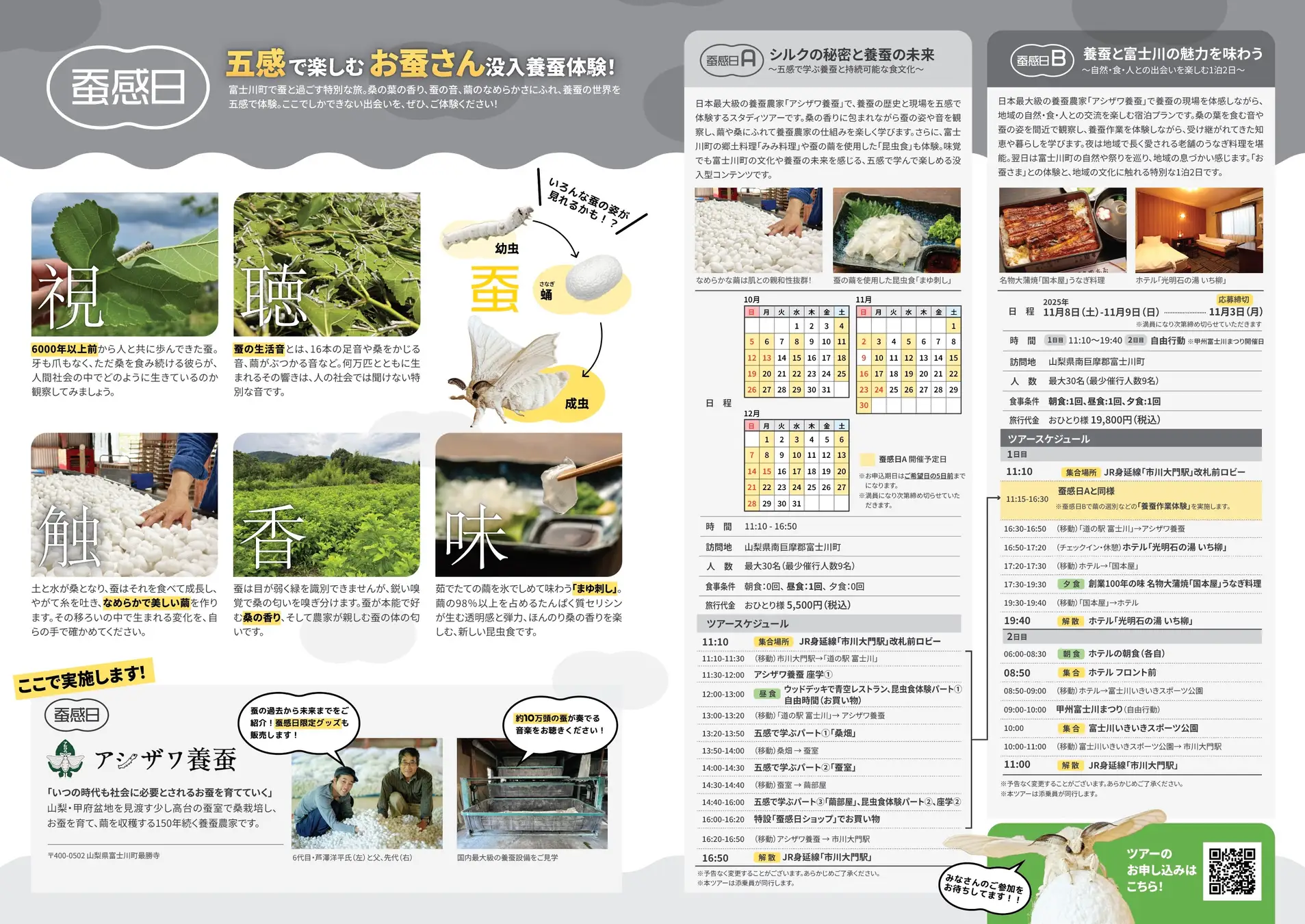 アシザワ養蚕(所在地:山梨県富士川町、代表:芦澤洋平)とTAKEO株式会社(本社:東京都台東区、代表取締役:齋藤健生)は、株式会社JTBと共同で、2025年10月より山梨県富士川町にて「蚕感日(さんかんび)」を開催いたします。人と蚕の6000年の歴史と未来を五感で楽しむ、観光とはひと味ちがう特別な体験です。