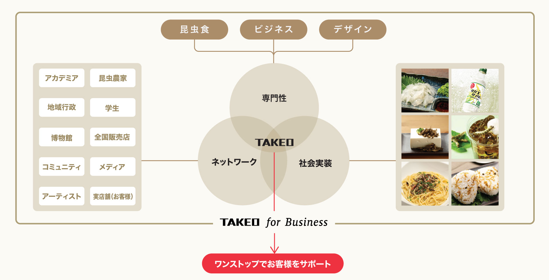 私たちは、この10年間、生活者に最も近い場所で昆虫食ビジネスに取り組んできました。現場で直接感じ取った経験や知見は、過去の数値データや未来予測からは得られない、昆虫食の潜在的な価値を示しています。この価値をさらに広げるため、「TAKEO for Business」を通じて、様々なの企業と連携しながら、懐かしくも新しい食材である「昆虫」の魅力を共に創っていきたいと考えています。